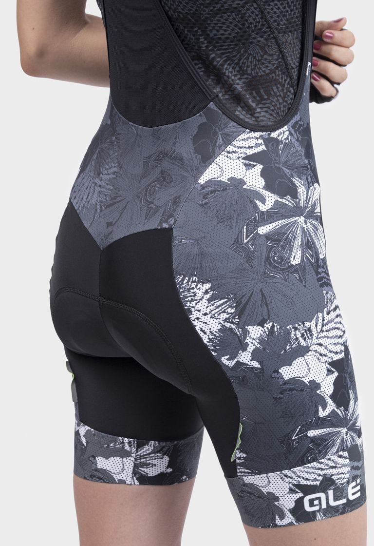 Die Amazzonia kombiniert Komfort und florale Grafiken. Perfekt abgestimmt mit dem passenden Trikot verleiht es einen extravagante Stil der Trägerin. Für die Träger wurden ein offenes gewebtes Material gewählt, um Gewicht zu reduzieren und auch die Passform zu verbessern. Das verwendete Textil, für die Rückseite der Hose, verbessert die Haftung am Sattel und garantiert eine abdeckende und widerstandsfähige Performance. Das verlängerte Bein und der griffige Einsatz an der Innenseite des Beinbündchens, hält die Amazzonia Trägerhose stabil und in Position.