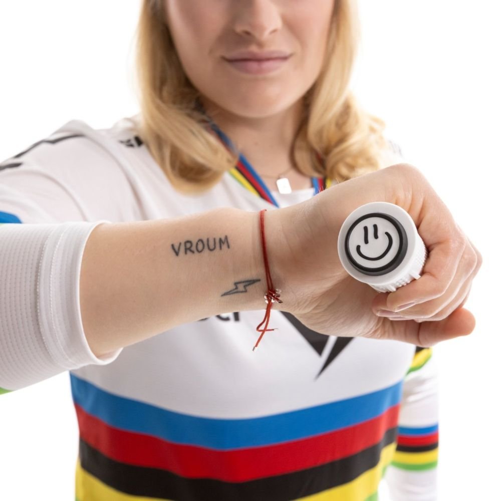 Für die technischen Features des GDH Team lieferte die Saalbacherin entscheidenden Input in der Entwicklung. In der Special Vali Höll Edition dieses Griffs durfte sie sich sogar designtechnisch austoben. Die dezenten Symbole und Piktogramme an Klemmring und einem der Endplugs sind die gleichen wie am Downhillsattel der Edition. Sie haben laut Vali keine tiefenpsychologische Aussage. Vielmehr stehen sie für prägende Begriffe aus dem Leben der Ausnahmesportlerin wie Natur, Radsport, Speed oder ihre Heimat Österreich. Der große Smiley auf dem Endstopfen symbolisiert die lockere und fröhliche Einstellung der Weltmeisterin.