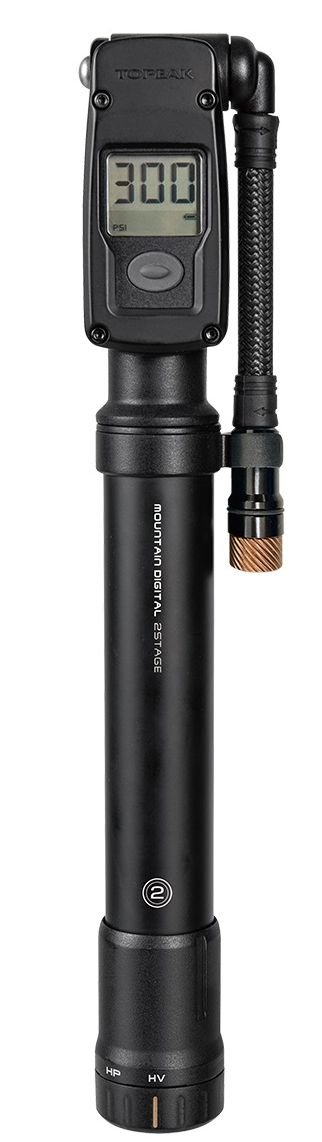 Die Mountain Digital 2Stage Minipumpe verfügt über einen innovativen 2Stage-Selector, mit dem zwischen hohem Druck zum Befüllen von Luftfedergabeln und -dämpfern oder großem Volumen zum Aufpumpen von Mountainbike-Reifen gewählt werden kann. Das integrierte, leicht ablesbare Digitalmanometer liefert genaue Druckwerte bis 20,7 bar / 300 psi. Der Pressure-Rite-Connector ist mit Schrader- und Presta-Ventilen kompatibel. Ventilschonendes Aufpumpen garantiert dabei der robuste, flexible und 360° drehbare Schlauch. Mit dem Luftablassknopf lässt sich zudem der richtige Luftdruck schnell und einfach einstellen.